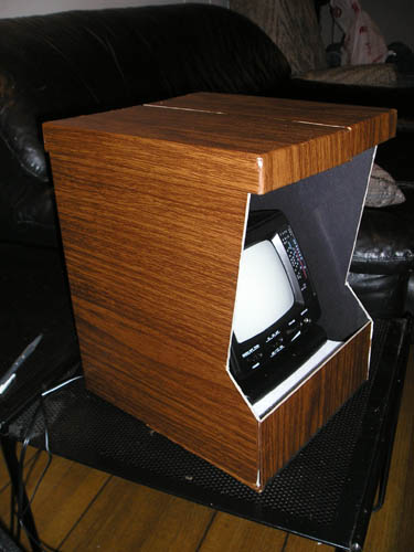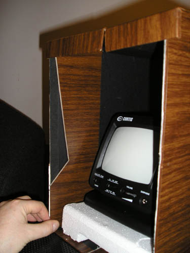 Propping the TV up, I need to cut an angle along the front to replicate that distinctive Pong look.